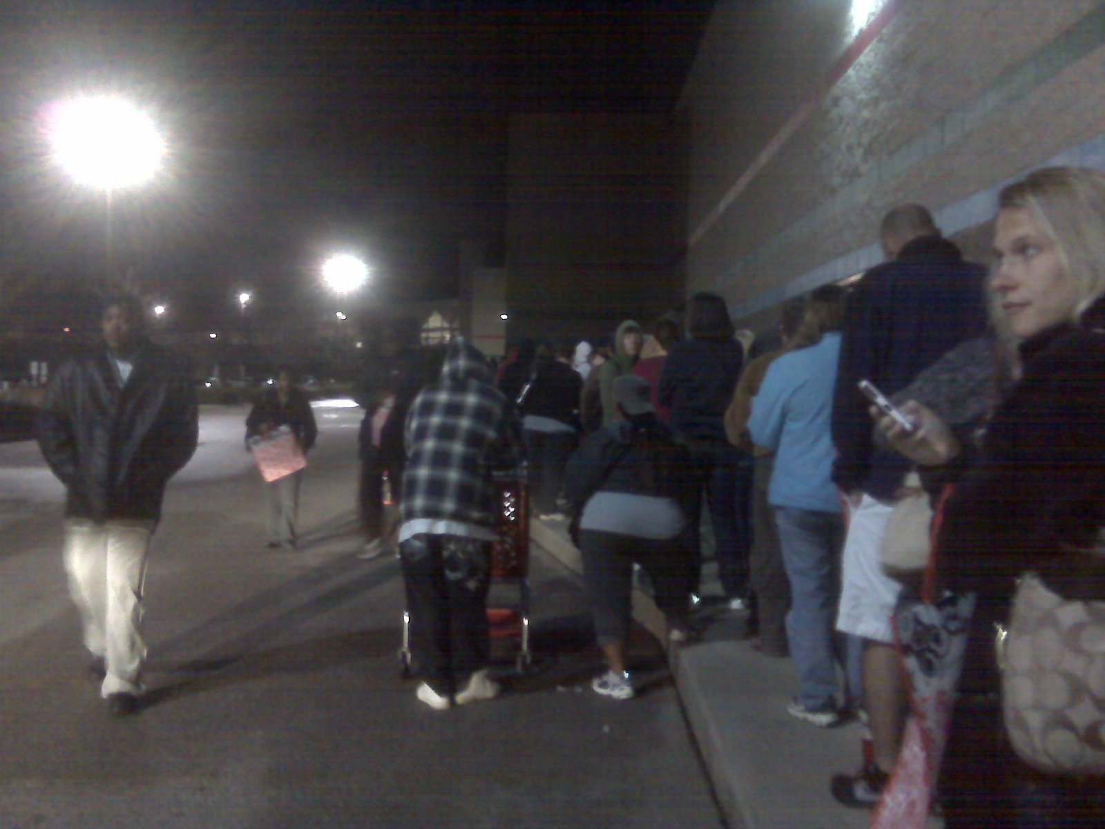 Neither one of us had anything we were going for or had to have. As the line made it’s way into the store it was pretty orderly, but some people did break into a run and started piling their carts high like on Supermarket Sweep. I got the last of the $3 crock pots as we passed by the end cap for them (it is teeny tiny though…about big enough for a cheese dip). I decided to go back and brave electronics to see if they had any TomToms for $97 (normally $250) left. They did but we had to wait in line and pay for it back there. I settled in for the wait and enjoyed watching the craziness around me: