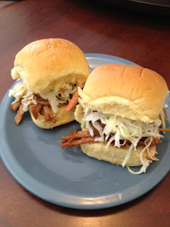 Last weekend I made pulled pork BBQ in the crock pot.  I LOVE BBQ!  North Carolina is known for our BBQ.  We basically have two styles- Eastern and Western (eastern is served more in the eastern part of the state and western more towards the mountains).  The Eastern style BBQ is more of a vinegar based BBQ and it is more "chopped" rather that "pulled".  The Western style BBQ is more saucy and sweet and it is not so chopped and more of a pulled or shredded style.  I like both!  This was more of a western style I would say.